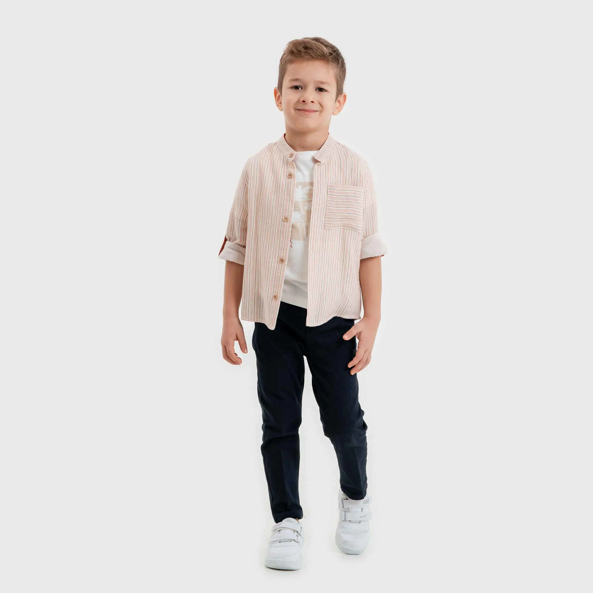 Printed short sleeve t-shirt with ivory-orange stripped shirt and blue pants set for little boys by Lemon. Comfortable for warm weather, each item is woven in a soft and breathable linen blend. Fully lined, the shorts have tone-on-tone side button fastenings, an elasticated waist around the back, and a smart pleated detail on the front. Adjustable with a slide buckle on the back, the button-down waistcoat completes this classic set.