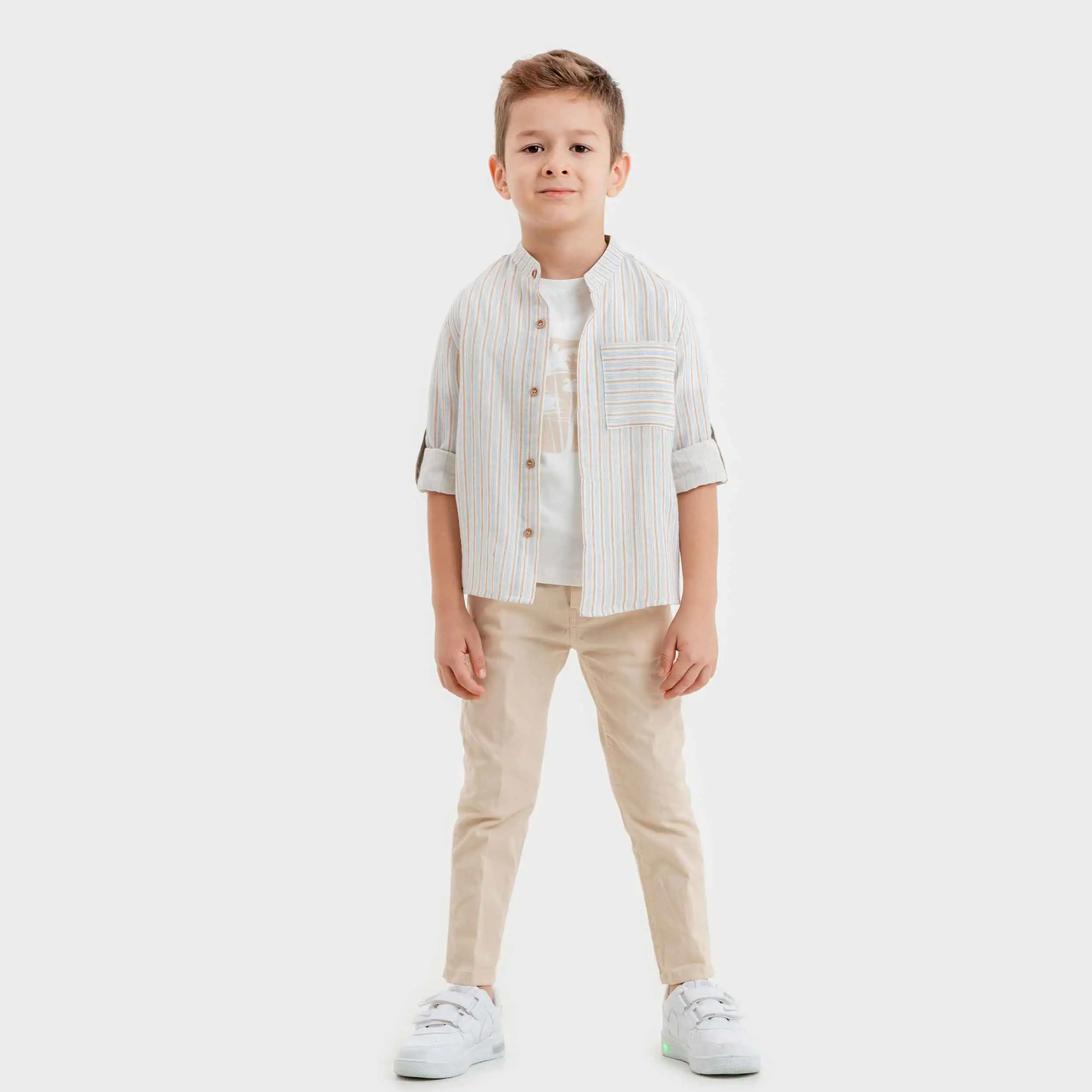 Ivory printed short sleeve t-shirt with ivory-beige stripped shirt and ivory pants set for little boys by Lemon. Comfortable for warm weather, each item is woven in a soft and breathable linen blend. Fully lined, the shorts have tone-on-tone side button fastenings, an elasticated waist around the back, and a smart pleated detail on the front. Adjustable with a slide buckle on the back, the button-down waistcoat completes this classic set.