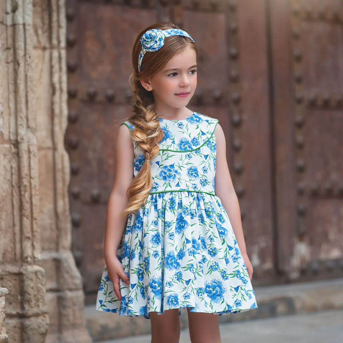 Beautiful blue dress for girls by Meraki, printed with blue and green floral pattern. Wonderfully feminine, this dress style has beautiful detailing. Lined in a soft cotton blend, it fastens with a concealed zip on the back for a neat finish.