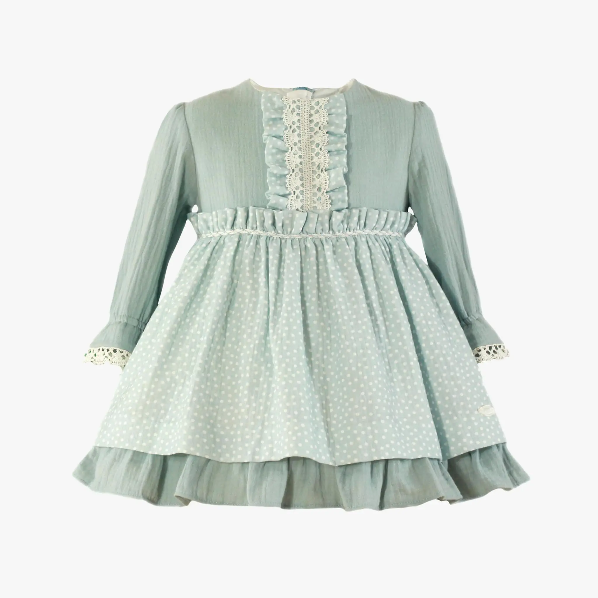In a lovely shade of pale blue, this delightful dress for girls is by Miranda. The ruffled detail on the bodice and the top layer of the skirt is patterned in a pretty blue and white polka dot print. The center of the bodice is embellished with a delicately crocheted lace trim. The matching crocheted lace trim is found on the gently elasticated cuffs as well. It is fully lined for comfort and fastened with a discreetly concealed zipper on the back for a smart look.