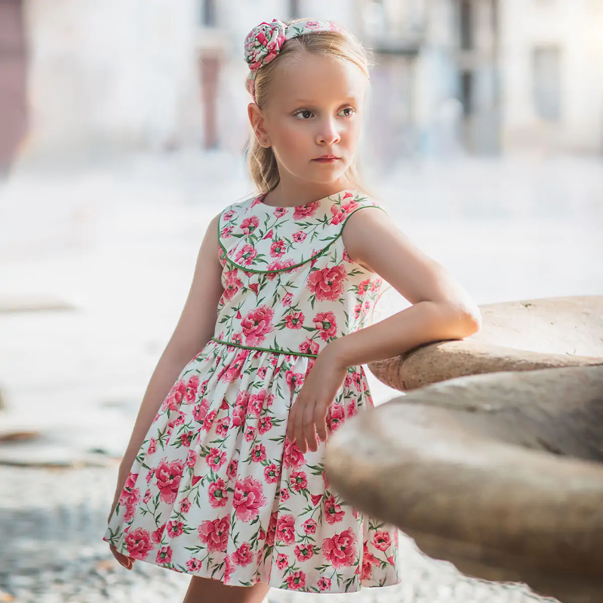 Beautiful pink dress for girls by Meraki, printed with pink and green floral pattern. Wonderfully feminine, this dress style has beautiful detailing.  Lined in a soft cotton blend, it fastens with a concealed zip on the back for a neat finish.