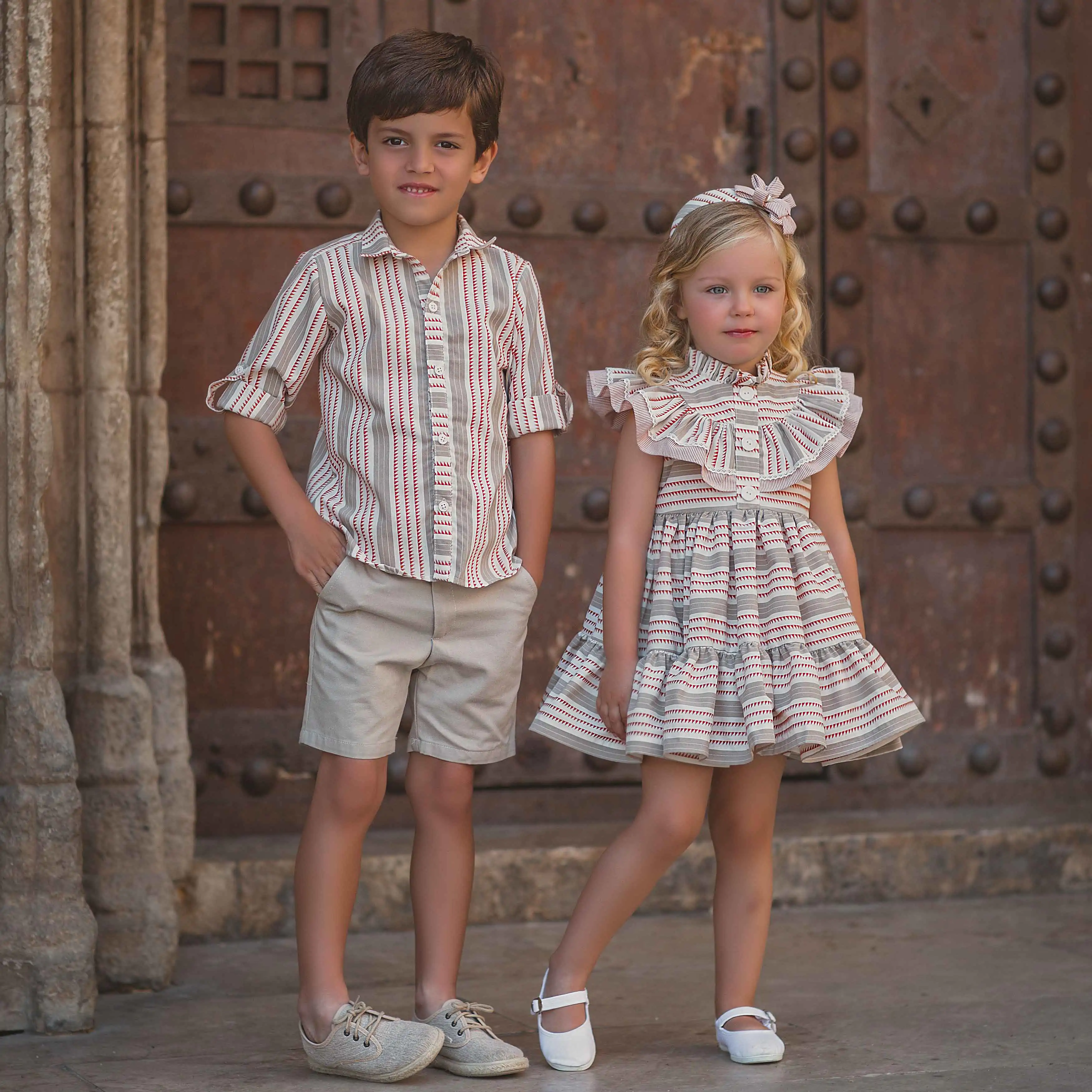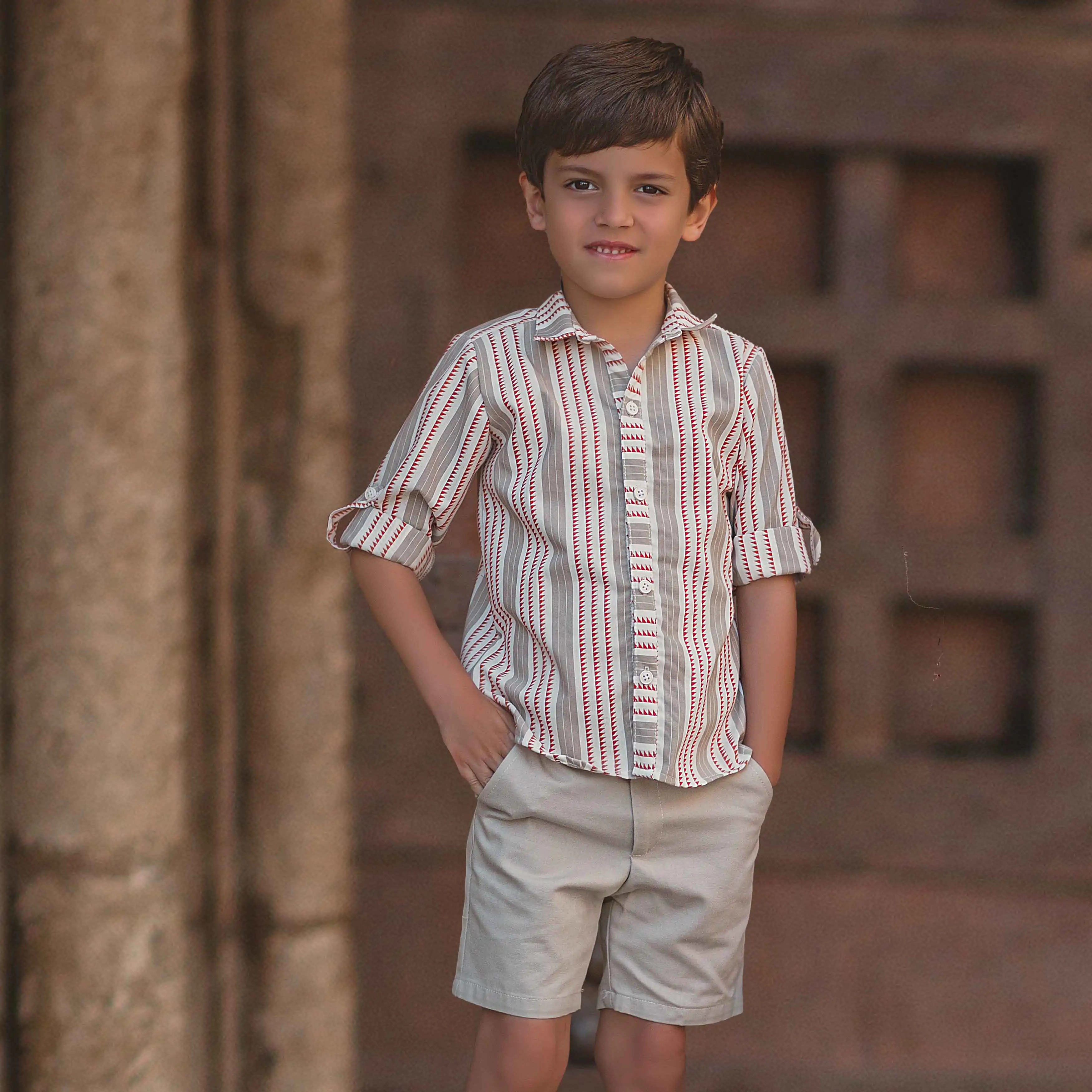 Beautiful boy set by Meraki, printed with ivory, beige and red pattern. The set has a cotton dress shirt and shorts. The dress is sold separetely.