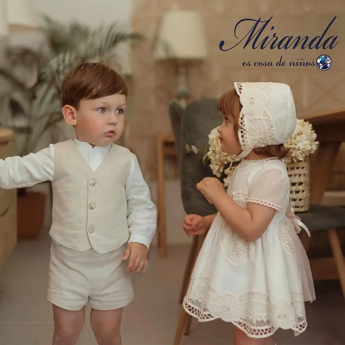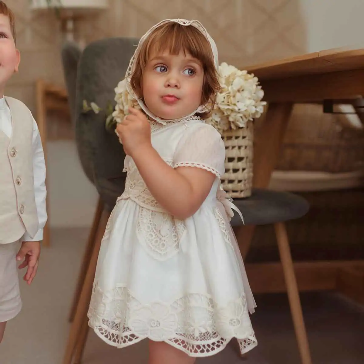 Special occasion dress for girls by Spanish brand Miranda, embellished with beautiful floral lace. Below the button fastenings on the back is a large, fixed, satin and tulle flower in beige and pale pink. The dress is fully lined in voile for comfort, with an extra, frilled layer for volume.