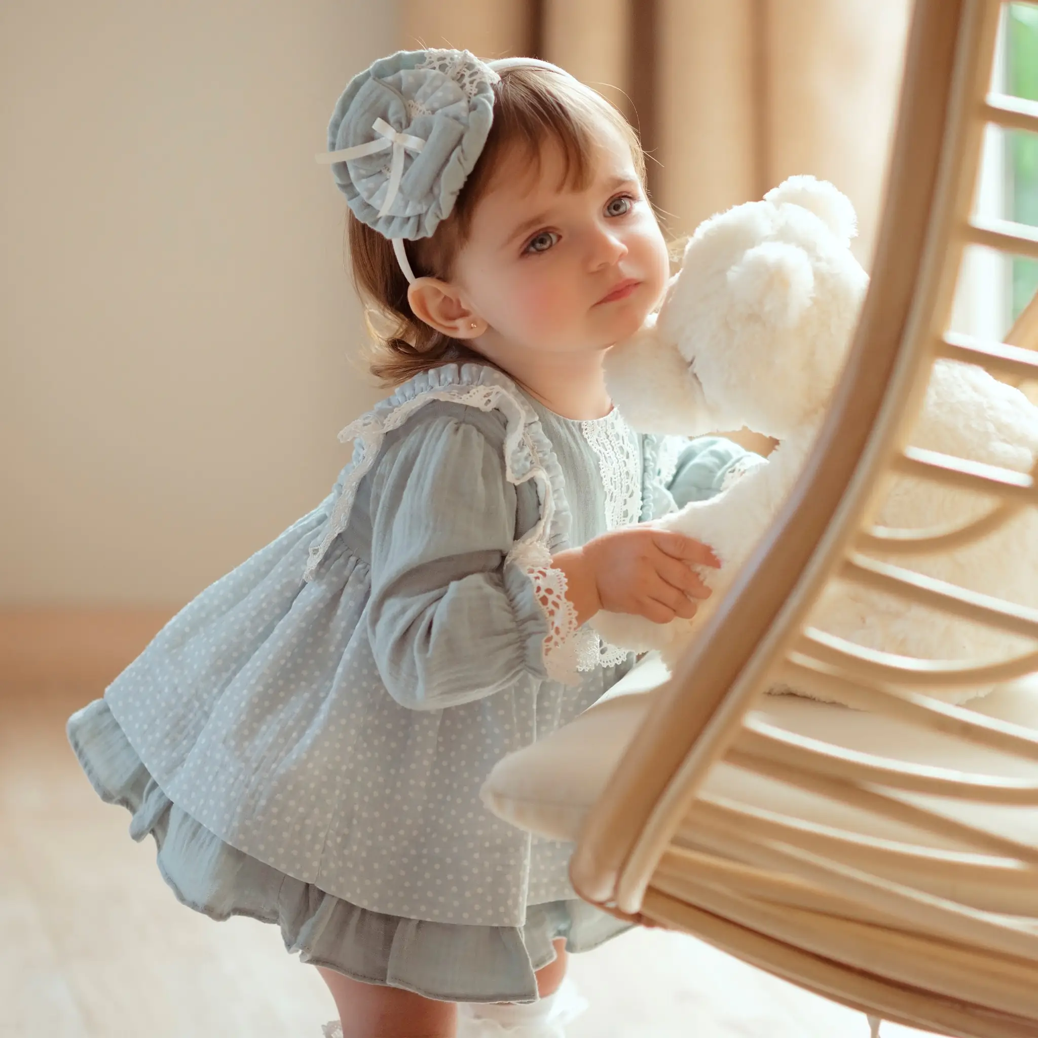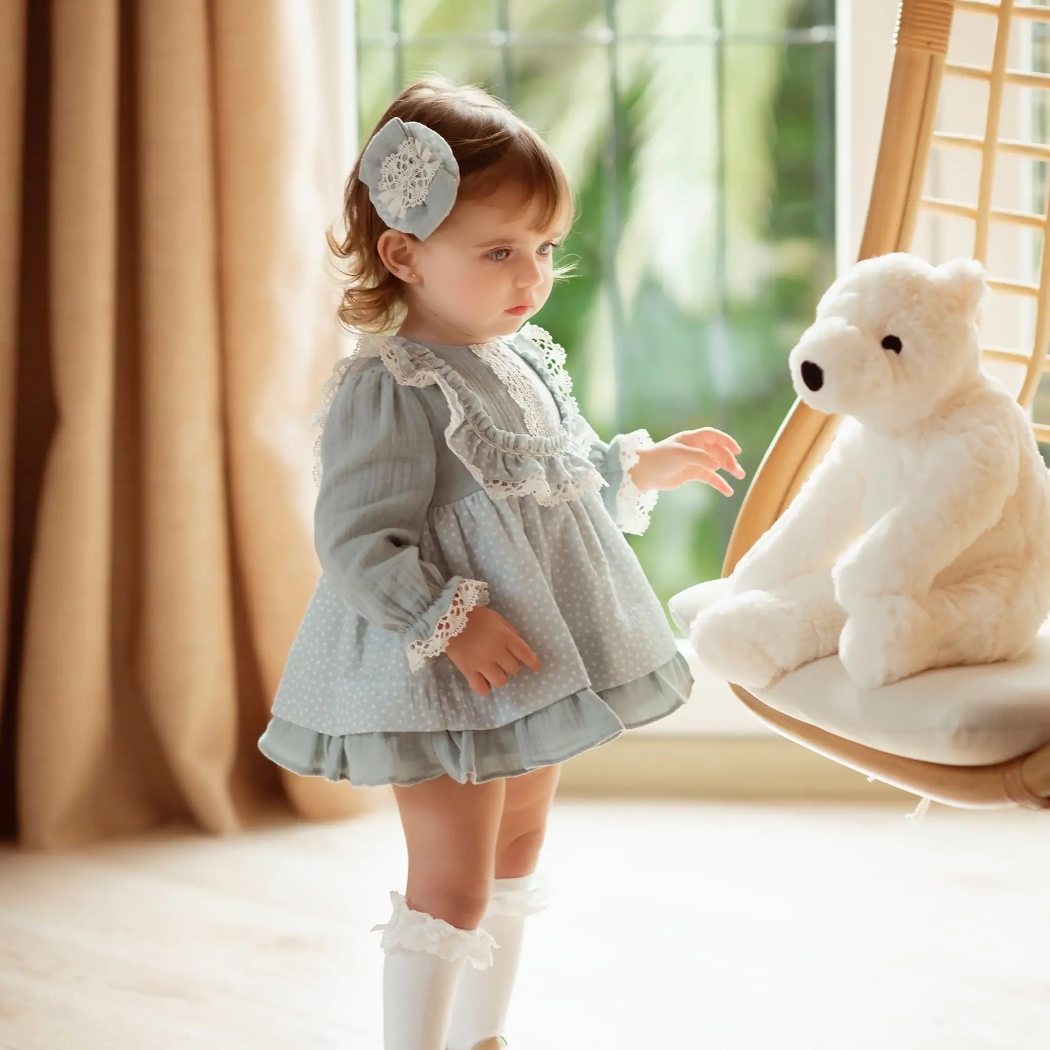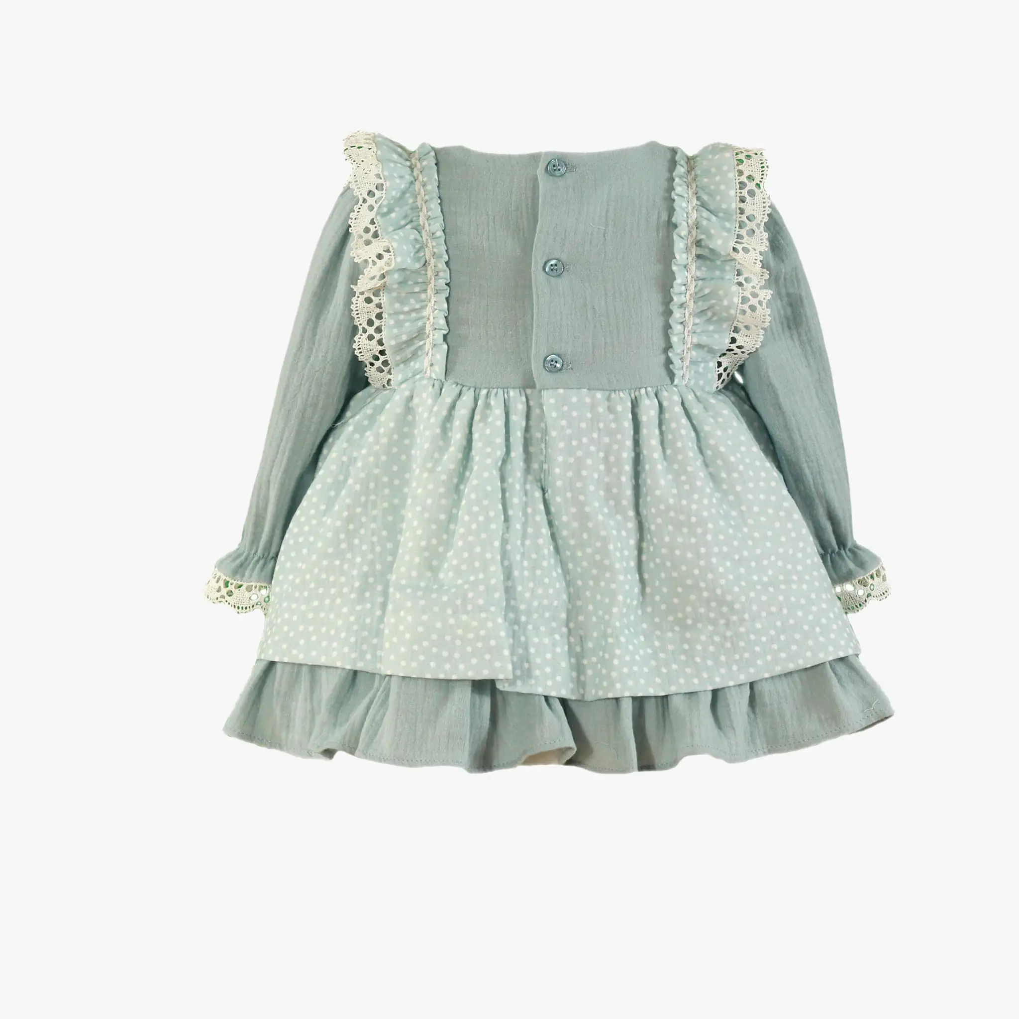 In a lovely shade of pale blue, this delightful dress for baby girls is by Miranda. The white polka dot patterned ruffle on the bodice is embellished with delicately crocheted white lace. A similar gorgeous crocheted lace trim is found on the center of the bodice as well as on the slighted elasticated cuffs. The double-layered skirt has a polka dot design on the top. It is fully lined for comfort and fastens with blue buttons on the back.