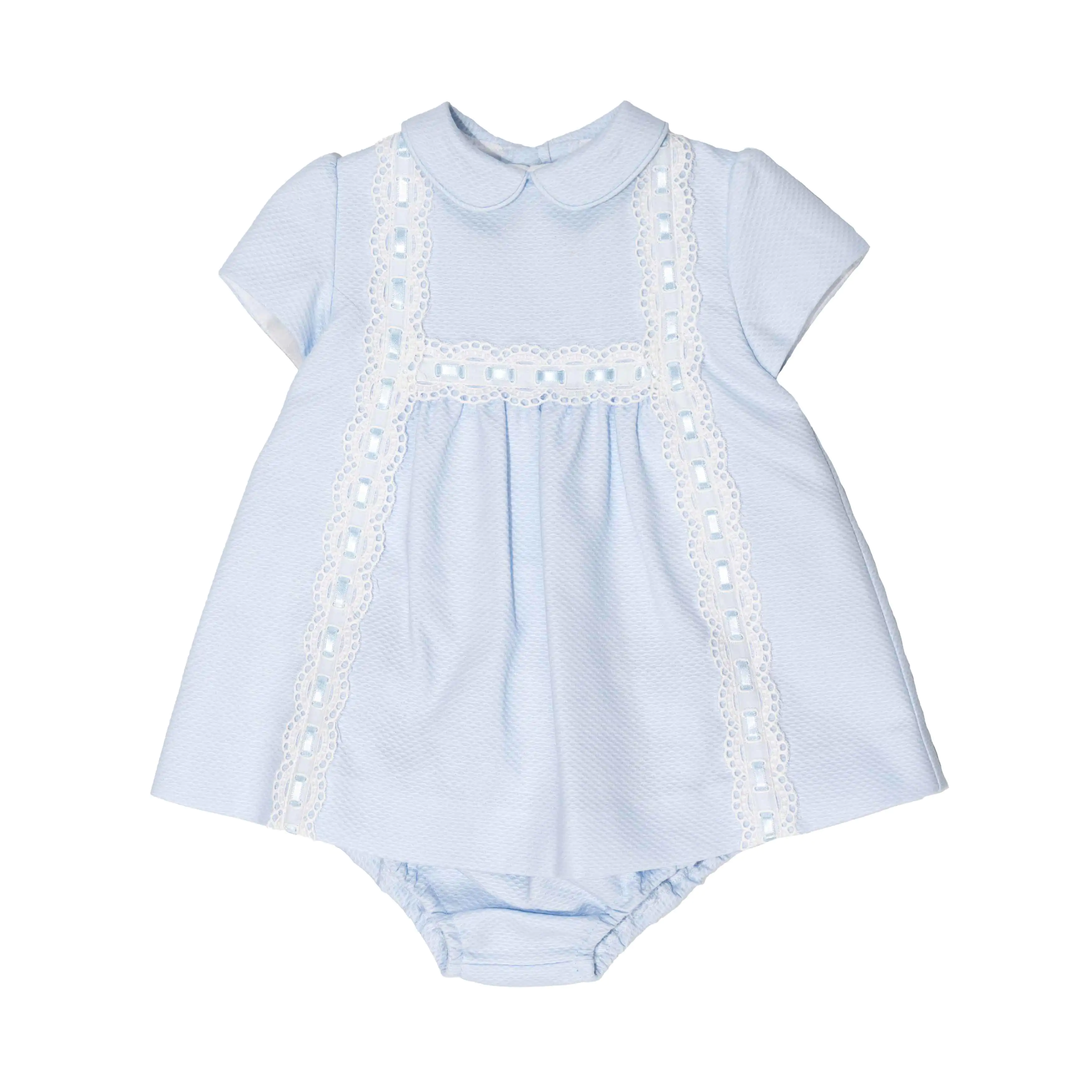 Pale blue dress and knickers set for baby girls by Spanish brand Miranda. Made in honeycomb-patterned cotton with a lightweight voile lining for comfort, with lovely white broderie anglaise lace and blue satin ribbon. The dress has a nice collar and short puffed sleeves.