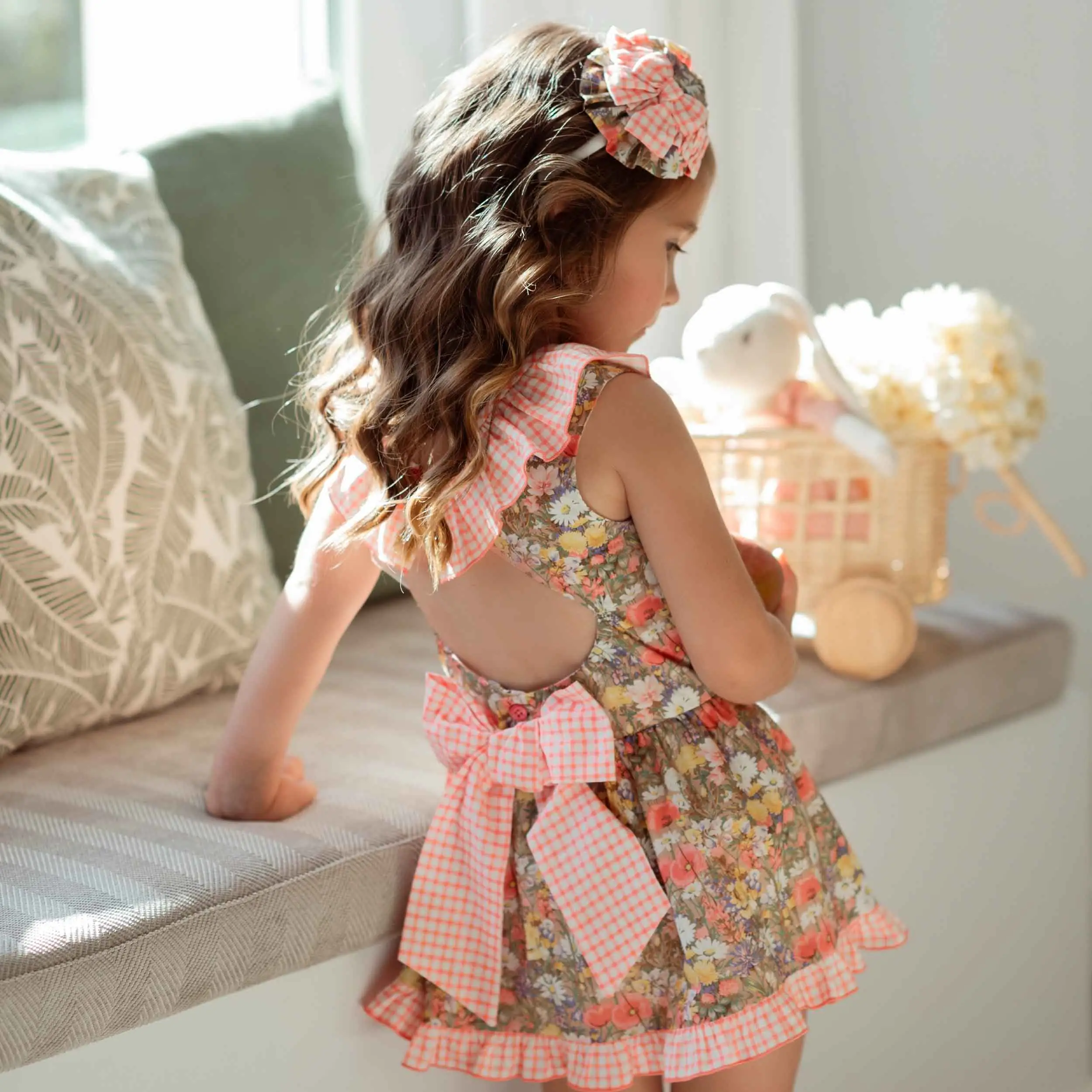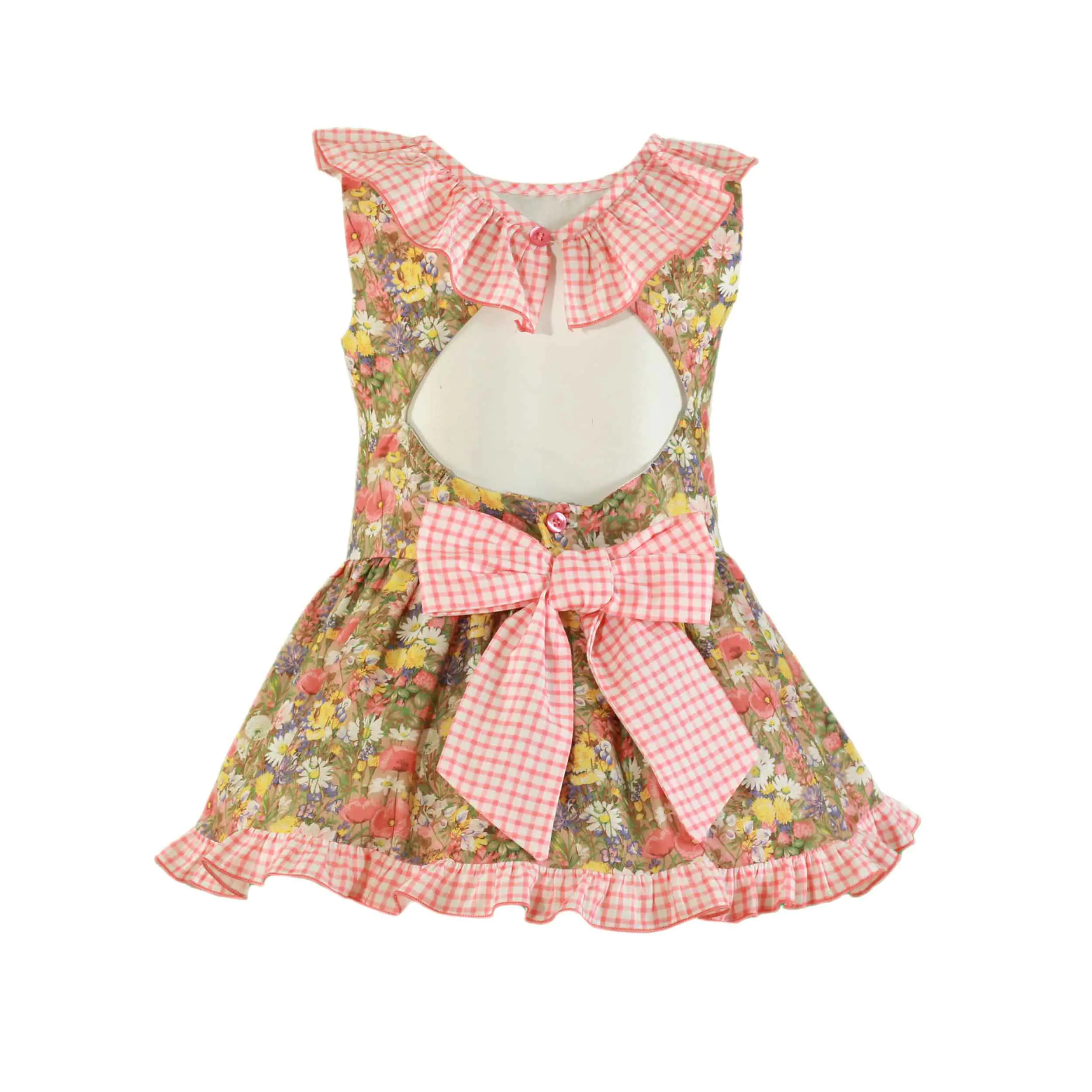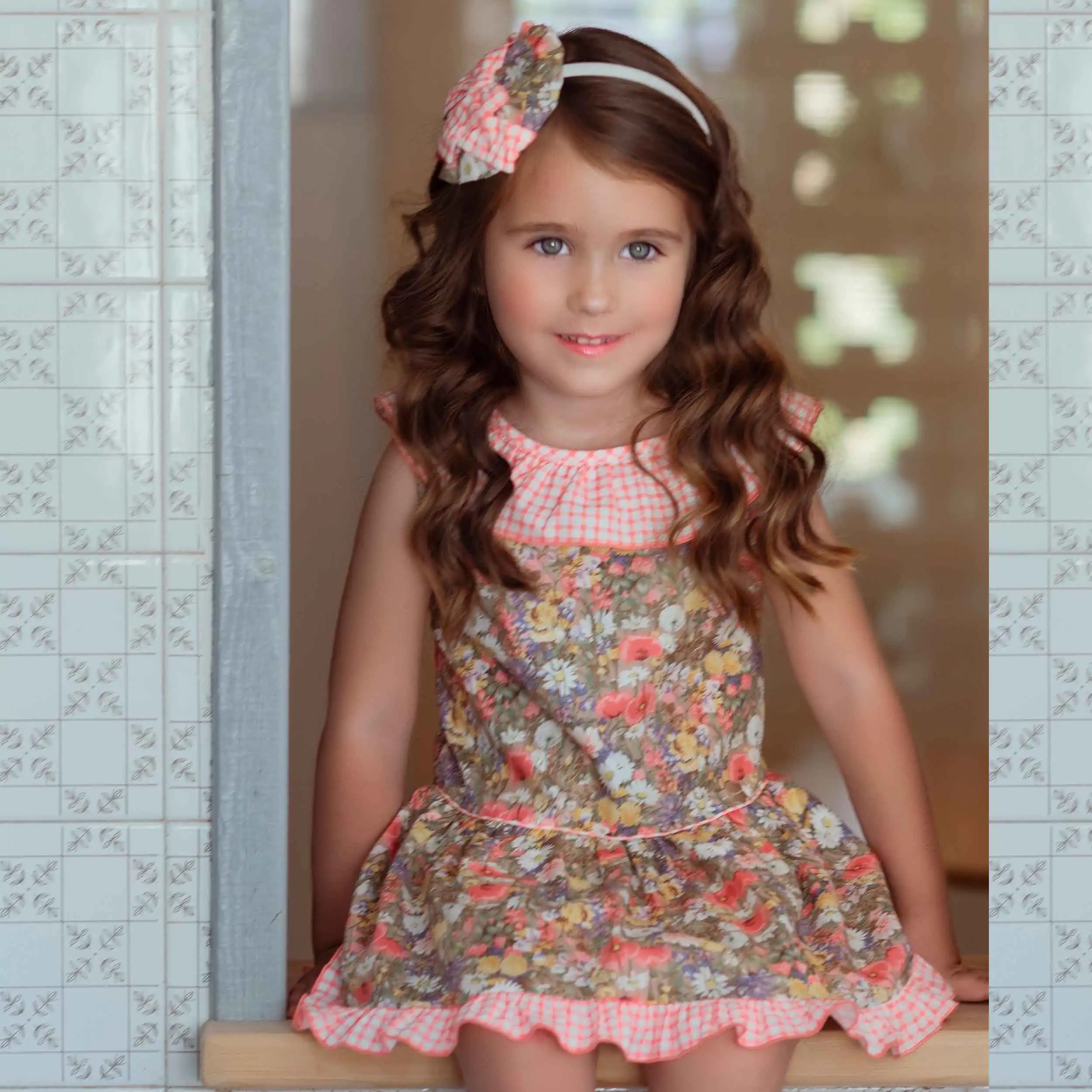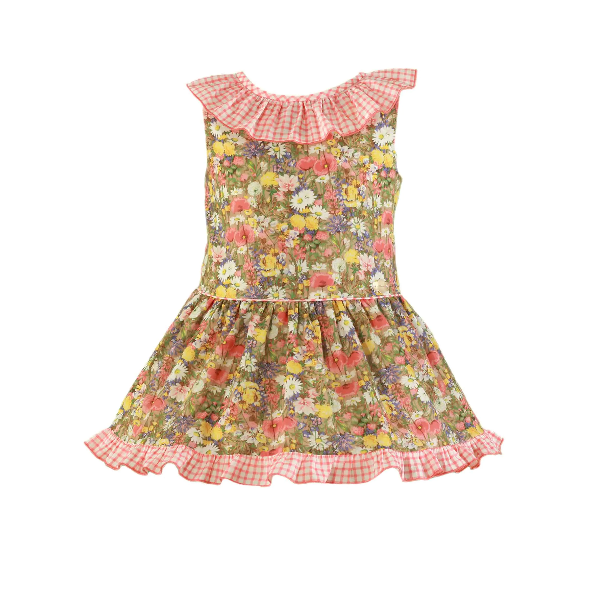 Spanish brand Miranda, beige and floral dress for little girls. Made in soft cotton, this sleeveless floral dress has decorative neckline ruffles.