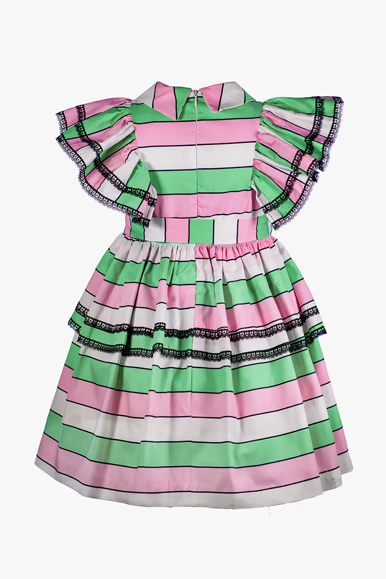Lovely for smart and special occasions alike, it has a shirt-style bodice with layered ruffled sleeves and faux silver button detailing on the front. Elegant black lace decorated the ruffles on the sleeves and the skirt, adding a contrasting style. It has a tie-up sash belt around the waist to cinch in the silhouette, and a full, flared skirt lined in tulle and cotton. It fastens with a smooth concealed zip on the back for a neat finish.