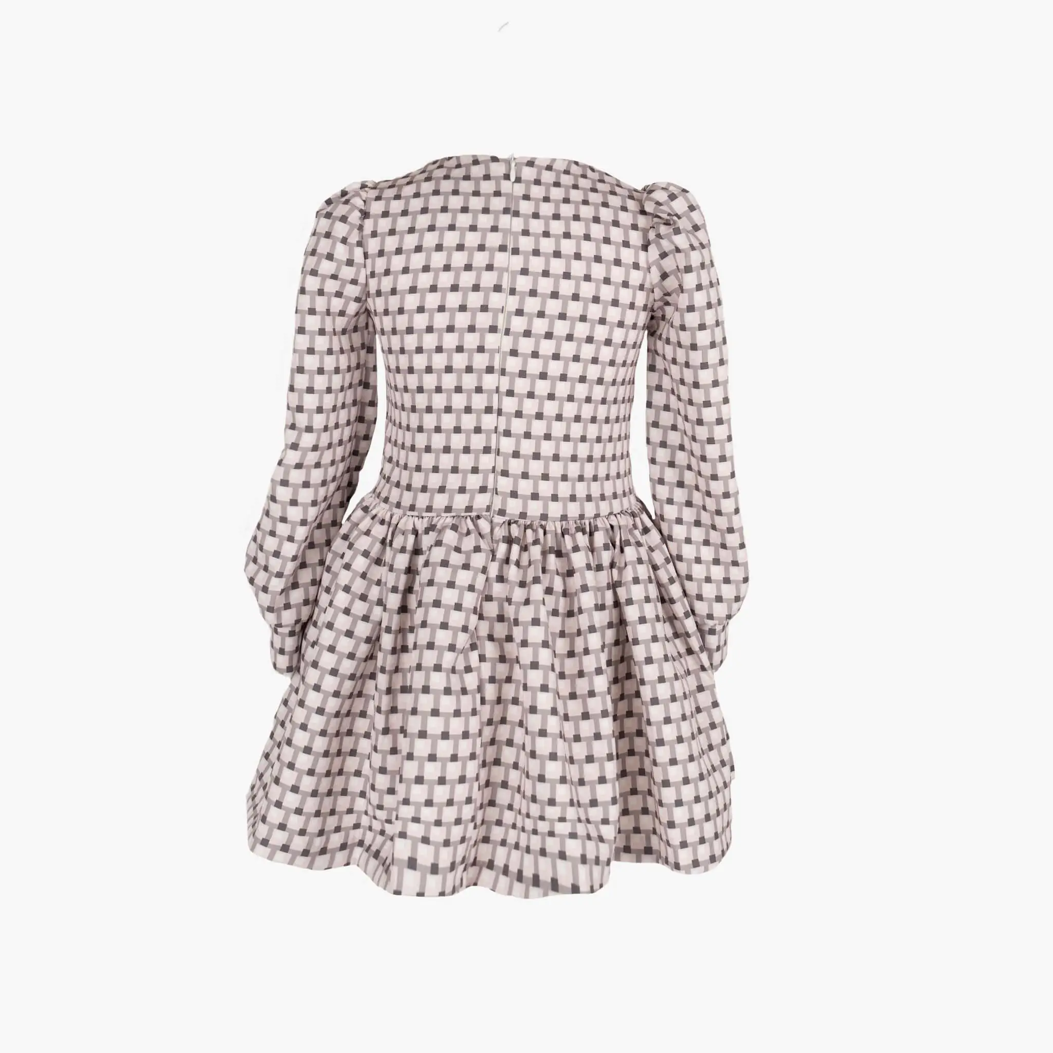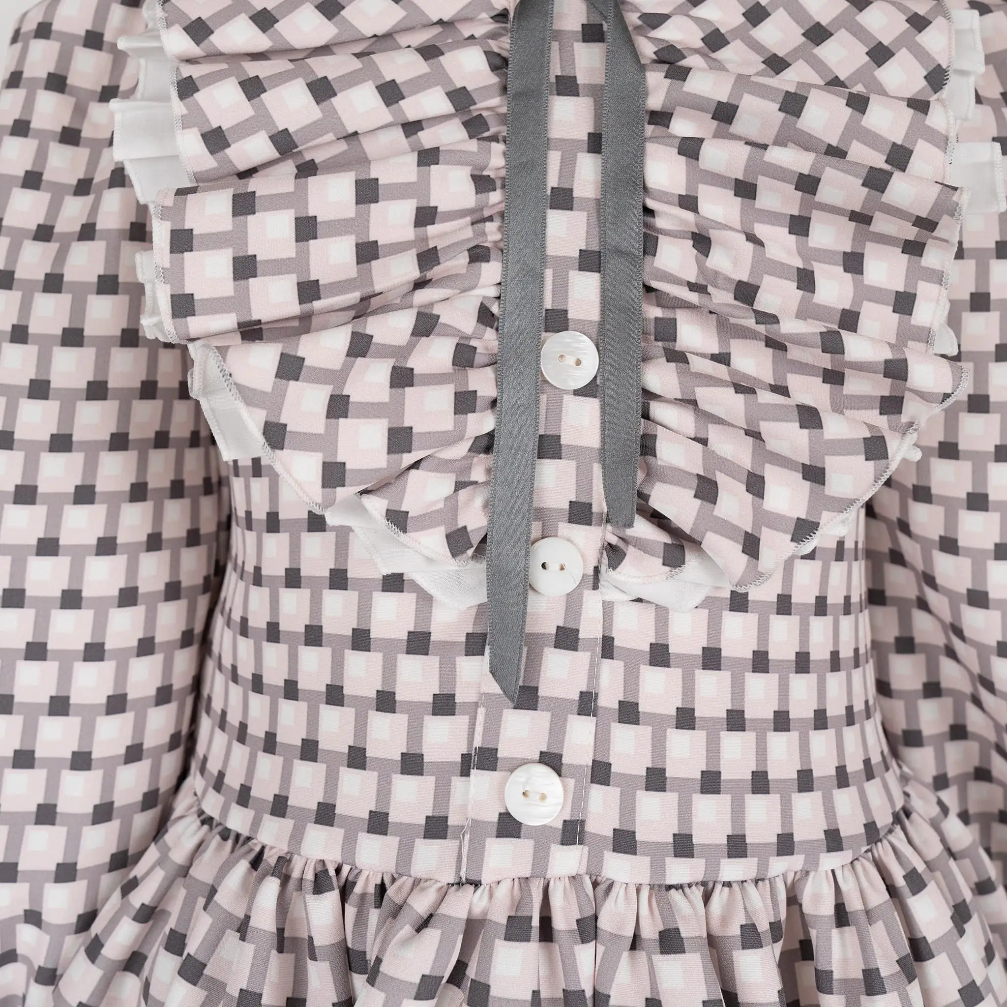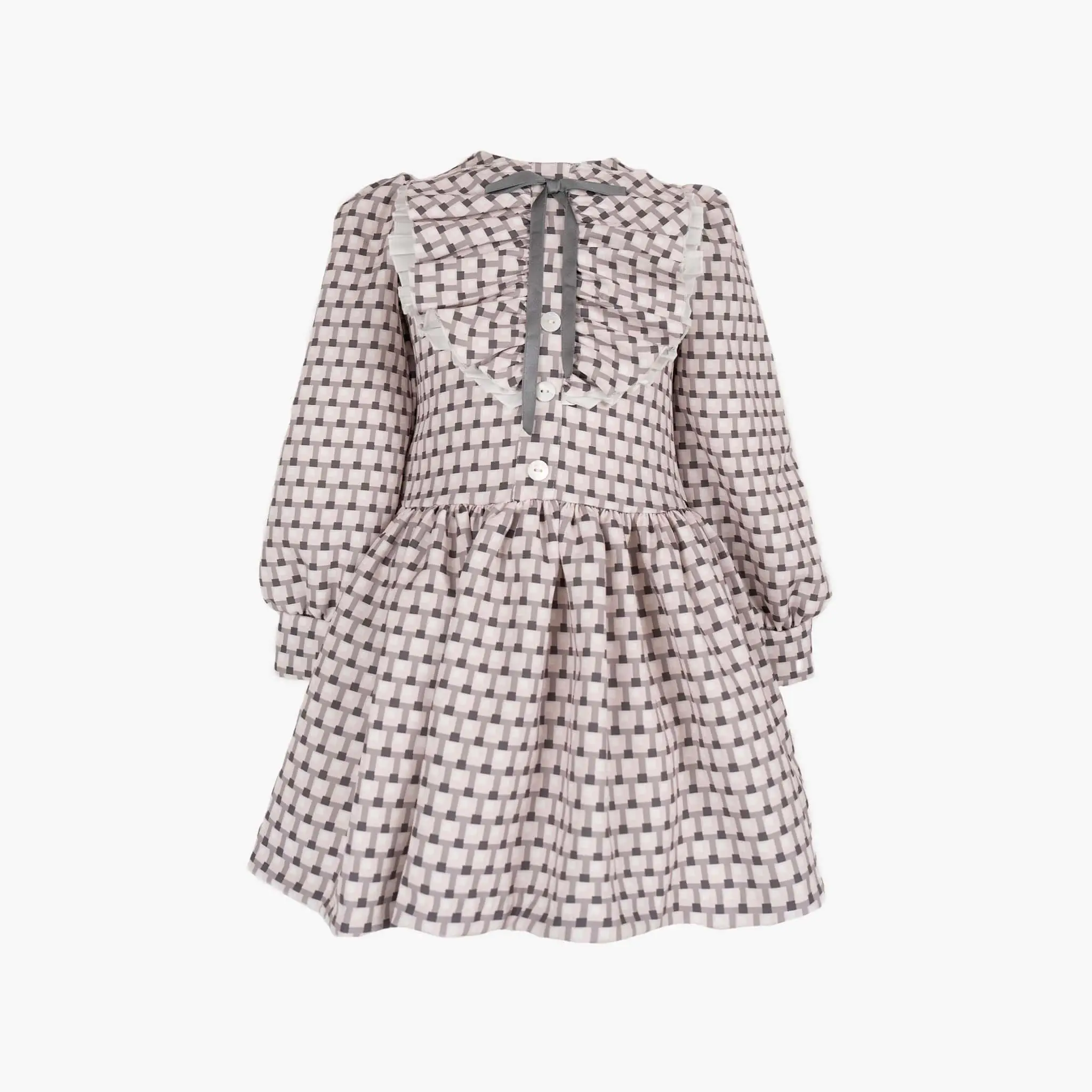 A pink and grey baby dress for girls by Meraki Spanish Brand. Traditional and elegant, this dress has a double-layered ruffled chest accompanied by a silky grey bow that is fixed at the neck. There are pearled white buttons along the bodice for design and a gathered skirt at the waistline. It is patterned in a geometric design. The elegant Peasant-like long sleeves give the dress a special look. It is fully lined in cotton voile for comfort and fastens with a discreet, concealed zip around the back.
