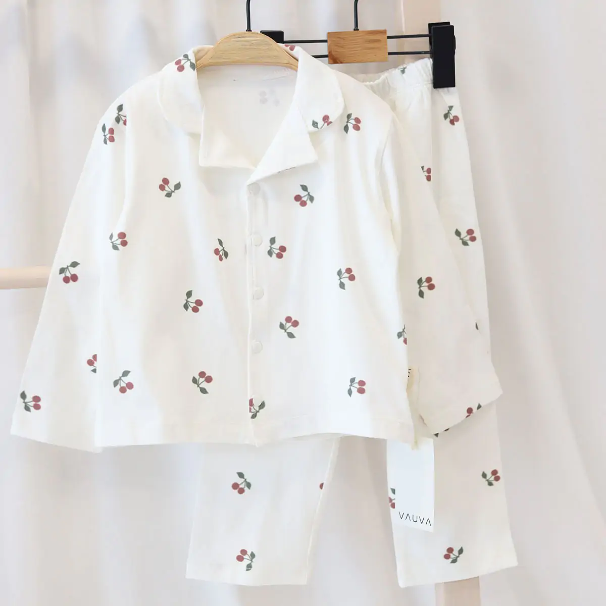 Cotton pajamas for kids by VAUVA, in a white and red cherries pattern. Soft and lightweight, the long sleeve open revere collar and front button fastenings. The matching pants are gently elasticated on the waist for comfort.